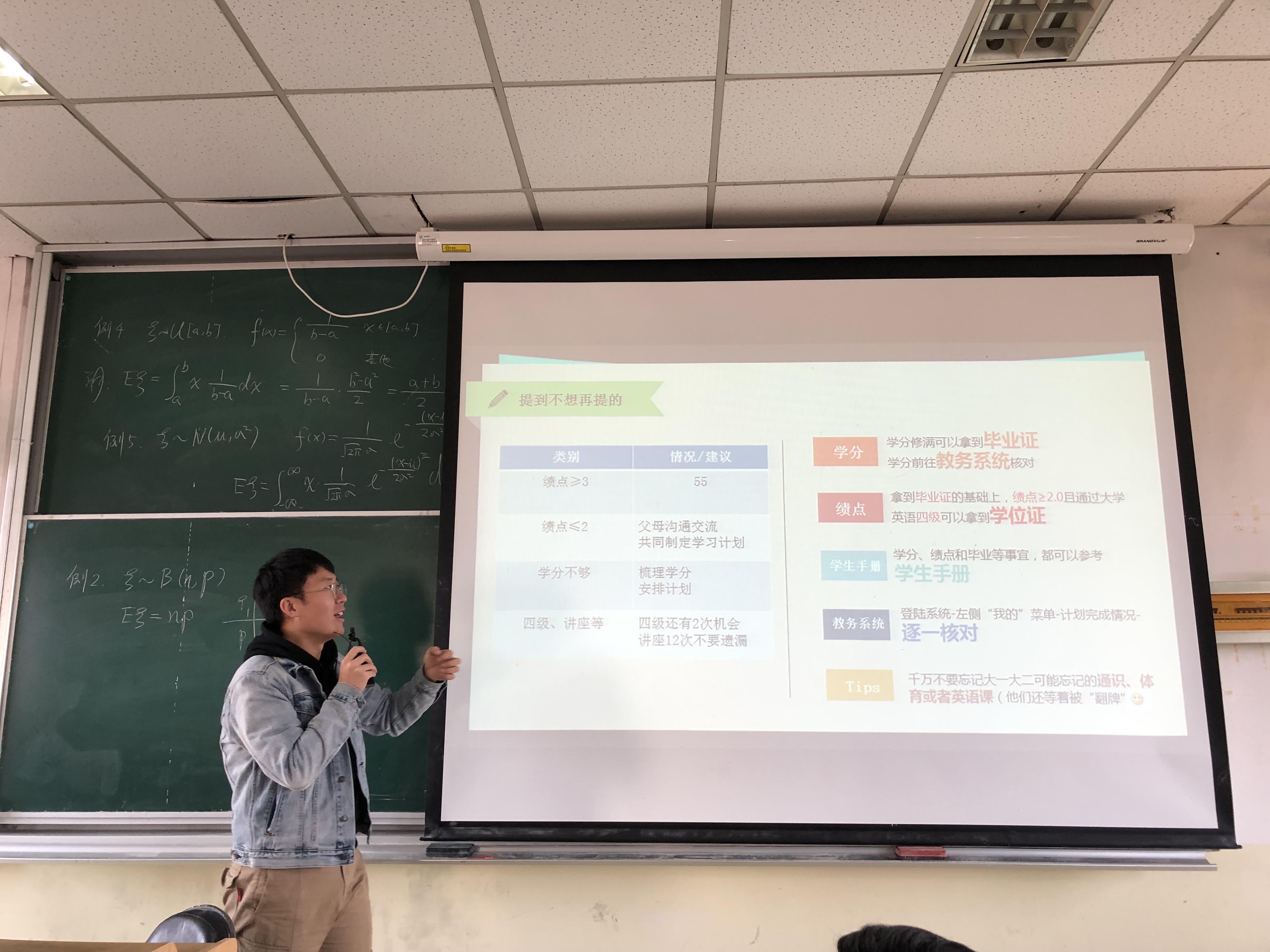 胡老师首先再次强调了学分和绩点问题,并明确指出获取毕业证和学位证的条件,督促同学们及时登录教务系统查询学分等情况;其次,结合前期调研,结合大多数同学的就业发展趋向,按照就业、考研和法考等方向梳理出时间轴。胡老师特地指出,选择就业方向的同学需要提前完善好简历,物色暑假实习,尽量选择有留用机会的,为秋招夯实基础。除此之外,胡老师还对选择出国、考公务员等方向的同学做了提醒——提前考好雅思、准备各类的材料、关注目标学校网站等。最后,胡老师对奉返徐相关工作进行了预告,提醒同学们珍惜在奉贤所剩不多的时光。