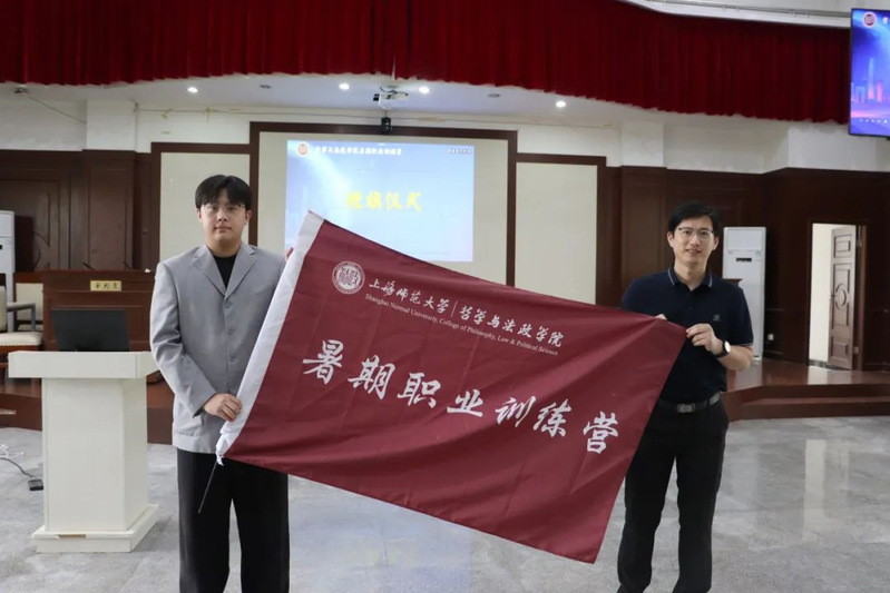 现金网 人力资源管理系教师李旭旦将营旗授予学员代表青哲中心(学生)负责人张扬,标志着2025年暑期职业训练营正式开启。